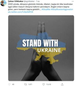 Gökbakar bir sonraki paylaşımında ise Ukrayna halkının yanında olduğu mesajını verdi. Gökbakar, “2022 yılında, dünyanın gözünün önünde, ülkeleri, başka bir ülke tarafından işgal edilen masum Ukrayna halkının yanındayım. Bugün onların başına gelen, yarın herkesin başına gelebilir” ifadelerini kullandı.