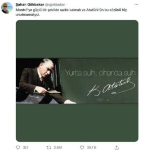 Atatürk’ün “Yurtta sulh, cihanda sulh” sözünün olduğu bir fotoğrafıyla Twitter hesabından paylaşım yapan Gökbakar, şu ifadeleri kullandı;