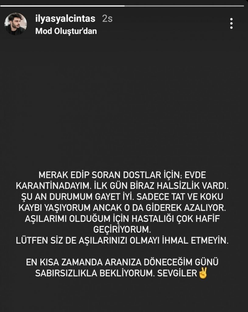Aşılarımı olduğum için hastalığı çok hafif geçiriyorum. Lütfen siz de aşılarınızı olmayı ihmal etmeyin. En kısa zamanda aranıza döneceğim günü sabırsızlıkla bekliyorum. Sevgililer” diye yazarak, durumu hakkında bilgi verdi.