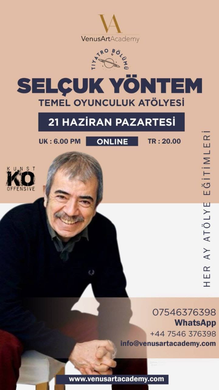 Usta oyuncu Selçuk Yöntem, Merkezi Londra’da bulunun VenusArt Academy Tiyatro Bölümünde online ders verecek. Temel oyunculuk atölyesine online olarak herkes katılabilecek. VenusArt Academy’nin kurucusu ve genel Koordinatörü Sonay Memoğlu, “İngiltere merkezli bir sanat akademisiyiz ancak bu tür atölye çalışmaları ve ders programlarıyla tüm dünyadan öğrencilerle buluşabiliyoruz. Selçuk Yöntem gibi çok değerli isimlerle bu atölye çalışmalarımız devam edecek. Ayrıca bünyemizde bulunan değerli eğitmenlerle daha uzun soluklu eğitimler de veriyoruz” diye konuştu.
