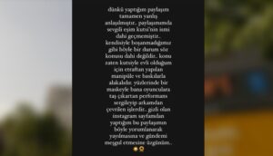 Ülker “Dünkü yaptığım paylaşım tamamen yanlış anlaşılmıştır. Paylaşımımda sevgili eşim Kutsi’nin ismi dahi geçmemiştir. Kendisiyle boşandığımız gibi böyle bir durum söz konusu dahi değildir. Konu zaten Kutsi’yle evli olduğum için etraftan yapılan manipüle ve baskılarla alakalıdır. Yüzlerinde bir maskeyle bana oyunculara taş çıkartan performans sergileyip arkamdan çevrilen işlerdir. Gizli olan Instagram sayfamdan yaptığım bu paylaşımın böyle yorumlanarak yayılmasına ve gündemi meşgul etmesine üzgünüm” ifadesini kullandı.