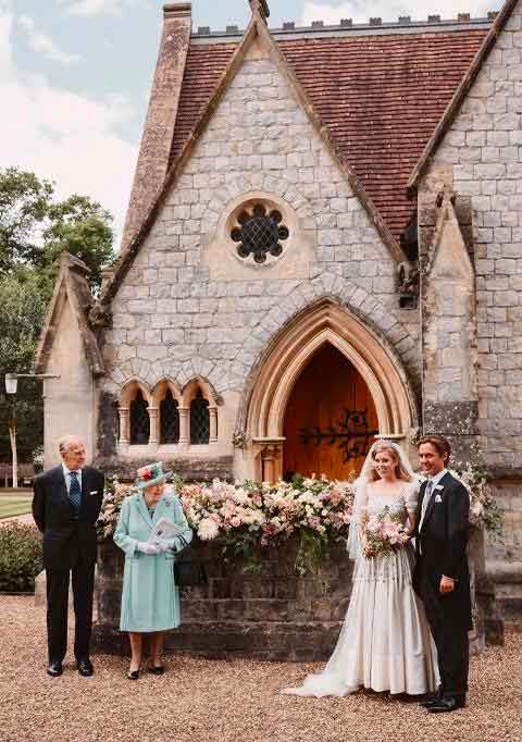 Fotoğrafların birinde sadece gelinle damat yer alırken, diğerinde çifte fiziksel mesafe bırakarak poz veren 94 yaşındaki Kraliçe II. Elizabeth ile 99 yaşındaki kocası Prens Philip görülüyor.