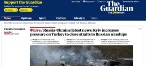 Haberde, Ukrayna Devlet Başkanı Vladimir Zelenskiy’nin Cumhurbaşkanı Tayyip Erdoğan’la görüşmesinden sonra yaptığı sosyal medya paylaşımının ‘Türkiye’nin Boğazları kapatmayı kabul ettiği’ şeklinde algılandığı belirtilerek, “Ukrayna Türkiye üzerindeki baskıyı artırıyor” denildi. The Guardian, bu başlığı, ana sayfasında son gelişmeleri canlı aktardığı haberinde de kullandı.