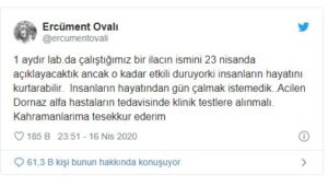 Türkiye’de ve dünyada virüs için aşı ve ilaç tedavi araştırmaları hız kesmeden devam ediyor. Daha önce yaptığı açıklamayla 23 Nisan’ı işaret eden Prof. Dr. Ercüment Ovalı’dan corona virüs tedavisi için yeni bir açıklama geldi. Ovalı, ”1 aydır laboratuvarda çalıştığımız bir ilacın ismini 23 Nisan’da açıklayacaktık ancak o kadar etkili duruyor ki insanların hayatını kurtarabilir. İnsanların hayatından gün çalmak istemedik. Acilen dornaz alfa hastaların tedavisinde klinik testlere alınmalı. Kahramanlarıma teşekkür ederim.” dedi.
