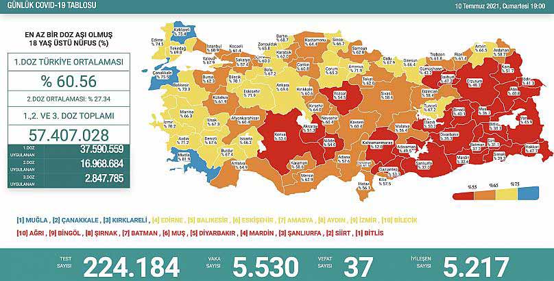 En az bir doz aşı uygulananların oranının en yüksek olduğu 10 il sırasıyla Muğla, Çanakkale, Kırklareli, Edirne, Balıkesir, Eskişehir, Amasya, Aydın, İzmir ve Bilecik oldu.