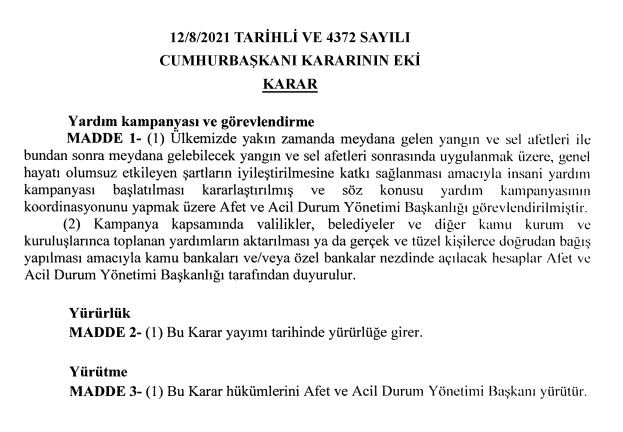 - 28/7/2021 tarihinde başlayan ve başta Akdeniz ile Ege kıyılarındaki iller olmak üzere farklı illerimizde meydana gelen yangın afetleri ile ülkemizin birçok bölgesinde meydana gelen sel afetlerinden zarar gören ve bundan sonra meydana gelebilecek yangın ve sel afetlerinden zarar görecek afetzedeler için yardım kampanyası başlatılması hakkında ekli Kararın yürürlüğe konulmasına, 5902 sayılı Kanunun 23’üncü maddesinin ikinci fıkrası gereğince karar verilmiştir.