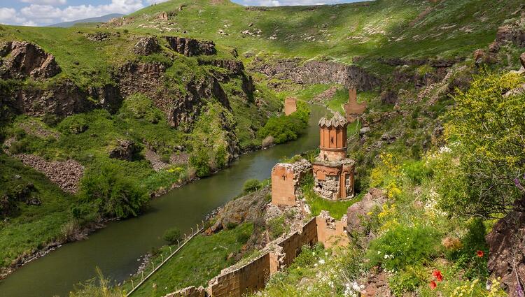 Antik kentin kıyısında yer alan Aras Nehri’nin Arpaçay kolu Türkiye ile Ermenistan sınırını oluşturuyor. 24 farklı uygarlığa ev sahipliği yapan bölgede çiçekler arasındaki tarihi kilise kalıntısı ve alt tarafında usulca akan nehir kartpostallık bir görüntü oluşturuyor.