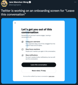 Cuma günü, yazar ve araştırmacı Jane Manchun Wong, yeni bir “bu sohbeti bırak” özelliğinin ekran görüntüsünü tweet’ledi. Özellikle birlikte; kullanıcı bir Twitter zincirinden kullanıcı adı etiketini kaldırabiliyor, insanların tekrar kendisinden bahsetmesini ve bu konuda bildirim almasını engelliyor.