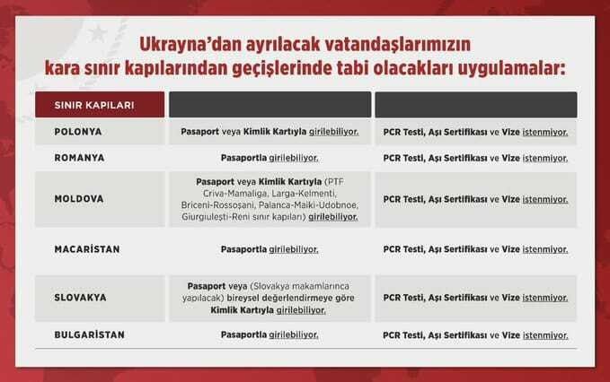 Twitter’dan paylaştığı mesajda Kıran, “Ukrayna’dan kara yolu ile tahliye operasyonlarımıza başladık. Tahliye operasyonlarımızla veya kendi imkanlarıyla ayrılacak vatandaşlarımızın sınır kapılarından geçişlerini kolaylaştırmak için bölge ülkeleriyle yakın iş birliği içindeyiz.” ifadesini kullandı.