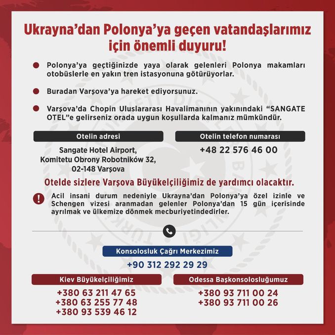 “Polonya’ya geçtiğinizde yaya olarak gelenleri Polonya makamları otobüslerle en yakın tren istasyonuna götürüyorlar. Buradan Varşova’ya hareket ediyorsunuz. Varşova’da Chopin Uluslararası Havalimanı’nın yakınındaki ‘Sangate Otel’e gelirseniz orada uygun koşullarda kalmanız mümkündür. Otelde sizlere Varşova Büyükelçiliğimiz de yardımcı olacaktır. Acil insani durum nedeniyle Ukrayna’dan Polonya’ya özel izinle ve Schengen vizesi aranmadan gelenler Polonya’dan 15 gün içerisinde ayrılmak ve ülkemize dönmek mecburiyetindedirler.”