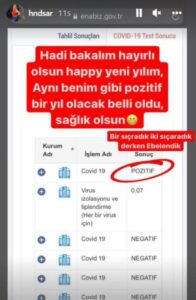 Sarıoğlu, Covid 19 testinin pozitif çıktığını ”Bir sıçradık iki sıçradık derken ebelendik” notuyla duyurdu.