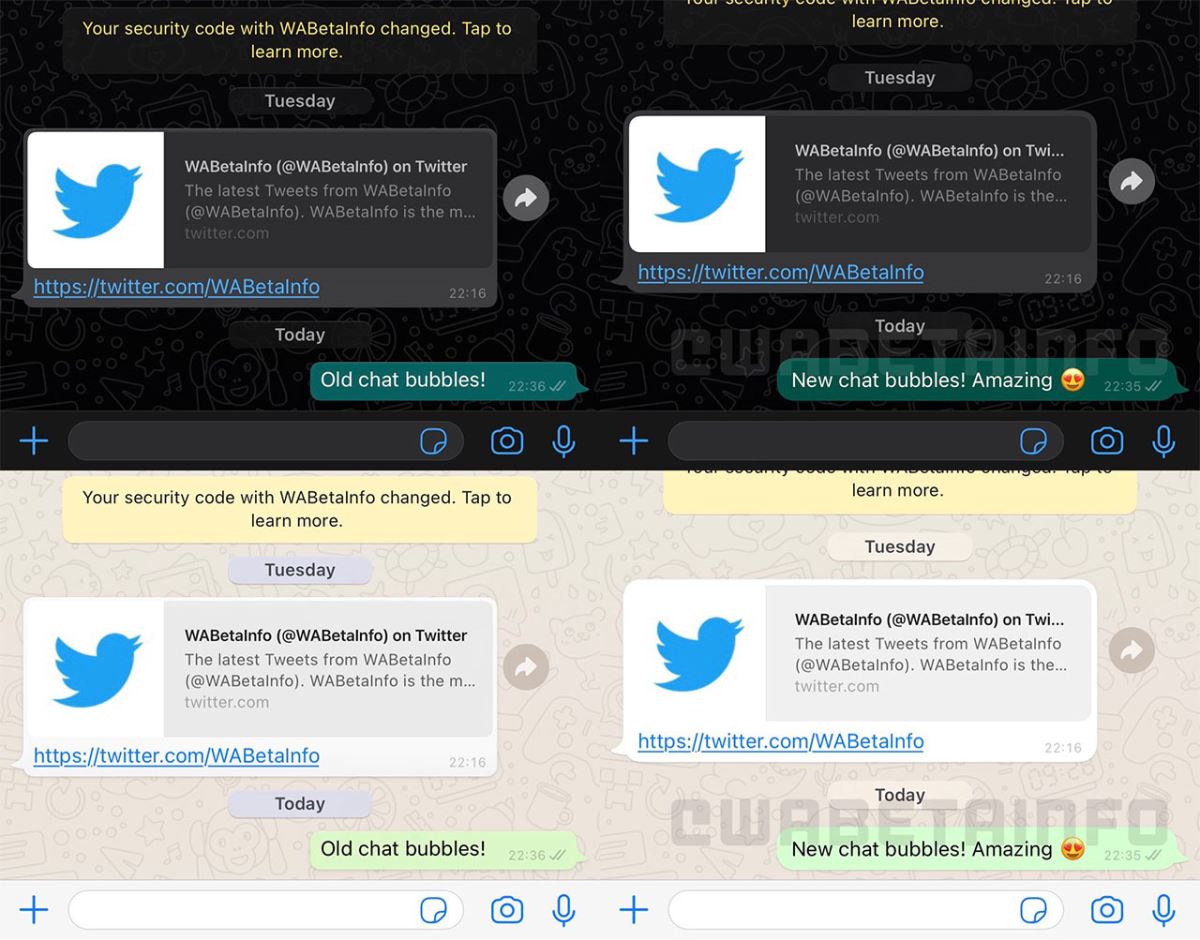Sohbet baloncuklarının güncel hallerini ve söz konusu güncellemeyle alacakları yeni hallerinde, daha yuvarlak kenarlara sahip oldukları görüldü. Bunun yanında biraz daha büyük olarak tasarlanan baloncukların renklerinde de ufak çaplı değişikliğe gidildi.