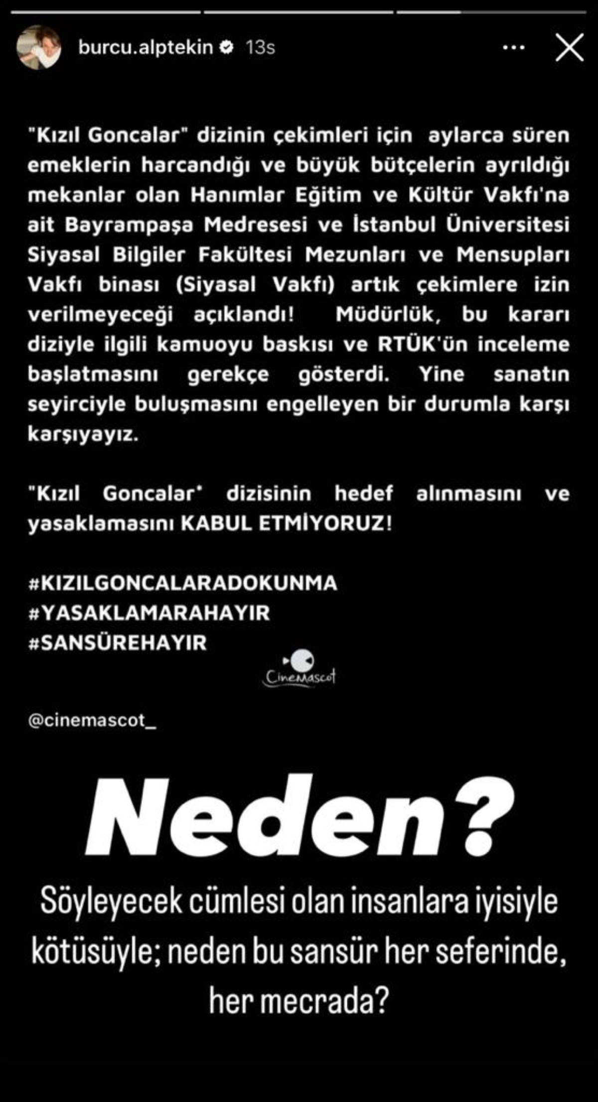 Alptekin yayınladığı mesajda Cinemascot’un açıklamasını alıntılayarak, “Neden? Söyleyecek cümlesi olan insanlara iyisiyle kötüsüyle; neden bu sansür her seferinde, her mecrada?” ifadelerini kullandı.
