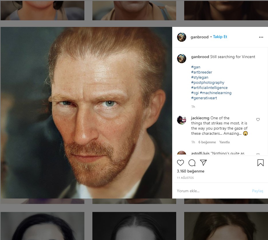 Bas Uterwijk isimli Hollandalı fotoğrafçı ve görsel tasarımcı, yapay zeka ile tarihi figürlerin portelerini oluşturdu. İsa, Jül Sezar, Kraliçe I. Elizabeth ve Vincent van Gogh’un aralarında yer aldığı portre koleksiyonu için sanatçı Uterwijk, eski resim ve heykellerin yanı sıra tarihi belgelerden de yararlandığını söyledi.