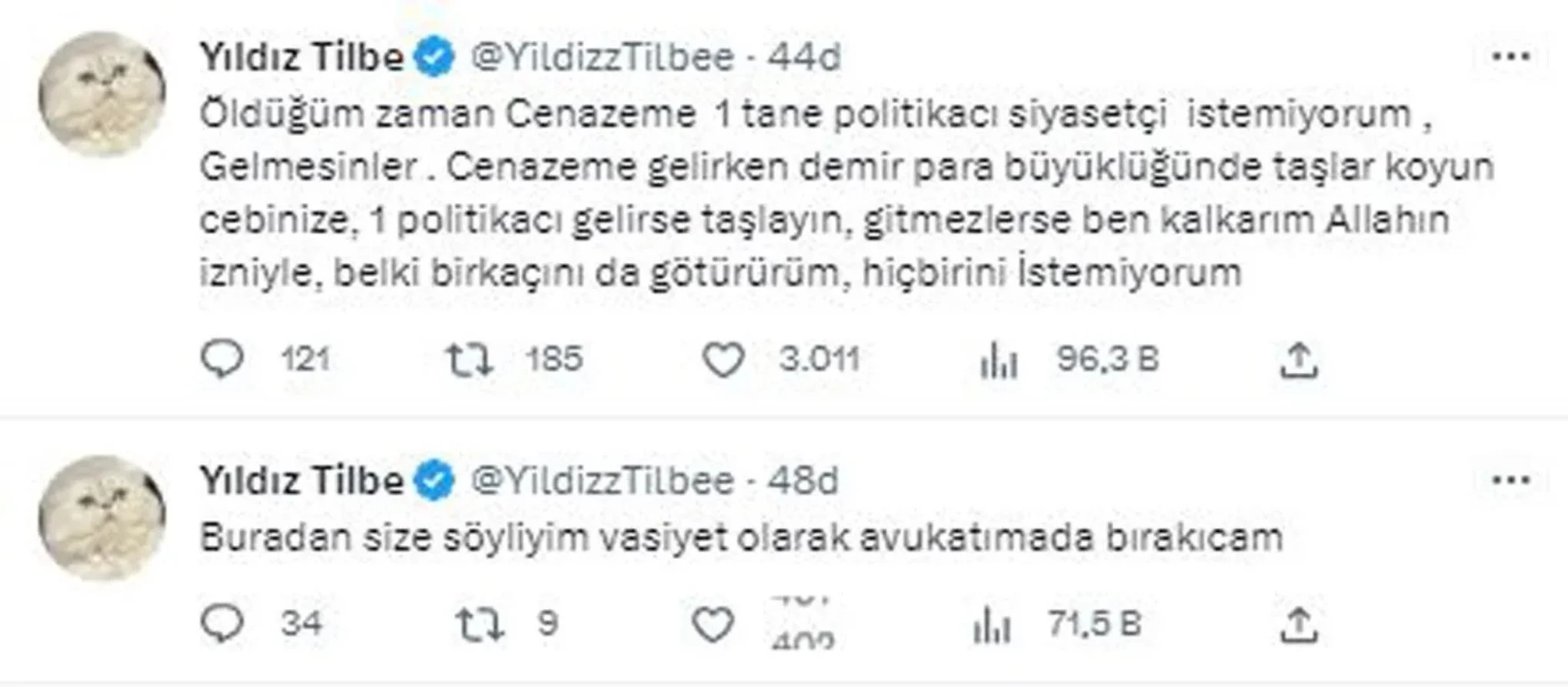 Twitter hesabından paylaşım yapan Yıldız Tilbe, “Allah hepinize sağlıklı uzun ömürler versin. Buradan size söyleyeyim vasiyet olarak avukatıma da bırakacağım. Öldüğüm zaman cenazeme 1 tane politikacı, siyasetçi istemiyorum, gelmesinler. Cenazeme gelirken demir para büyüklüğünde taşlar koyun cebinize, 1 politikacı gelirse taşlayın. Gitmezlerse ben kalkarım Allah’ın izniyle, belki birkaçını da götürürüm. Hiçbirini İstemiyorum” ifadelerini kullandı.
